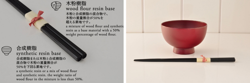 ・上図のお箸と一緒に写っている商品は樹脂素材もしくは木粉入り樹脂素材に塗り加工した商品という事です。
